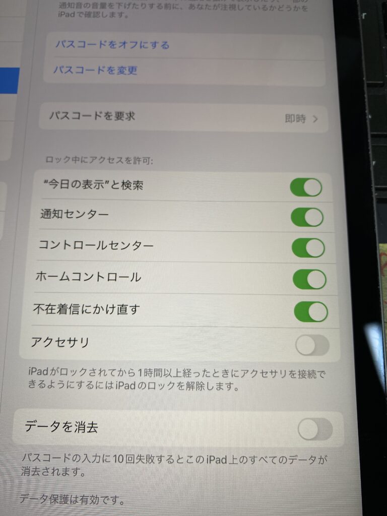 指紋認証やFace IDの失敗を重ねた上にパスコードを忘れて誤ったコード入力をしてしまうと、「iPadは使用できません iTunesに接続」と表示されます。そしてこうなってしまうとiPadの初期設定でロック中のアクセスを許可していません。『iPadがロックされてから1時間以上経った時にアクセサリを接続できるようにするにはiPadのロックを解除します』これが通常はオフになっています。もちろん、オフなのでアクセス不可。