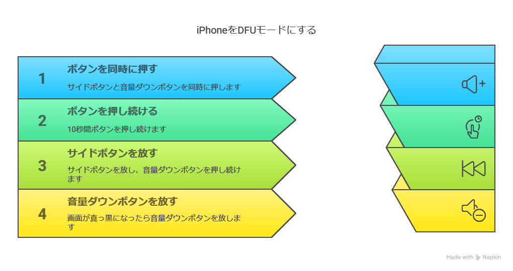 - DFUモードへの入り方は機種によって異なり、タイミングを間違えると失敗します。